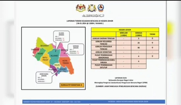 Tiga daerah terjejas iaitu Johor Bahru, Kluang dan Mersing yang melibatkan 96 orang penduduk terjejas daripada 25 buah keluarga.