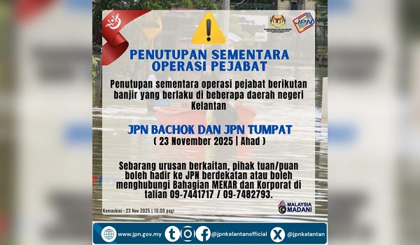 KOTA BHARU, 23 November - Operasi pejabat Jabatan Pendaftaran Negara (JPN) daerah Bachok dan Tumpat ditutup sementara waktu bermula hari ini, susulan banjir yang melanda negeri Kelantan.