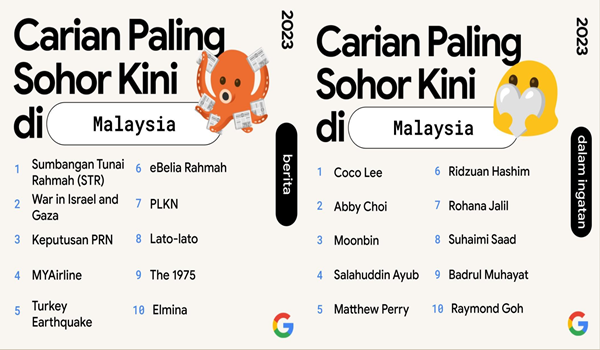 Kedudukan penuh 10 carian paling popular kategori “Berita” adalah 1) Sumbangan Tunai Rahmah (STR); 2) War in Israel and Gaza; 3) Keputusan PRN; 4) MYAirline; 5) Turkey Earthquake; 6) eBelia Rahmah; 7) PLKN; 8) Lato-lato; 9) The 1975 dan terkahir 10) Elmina.
