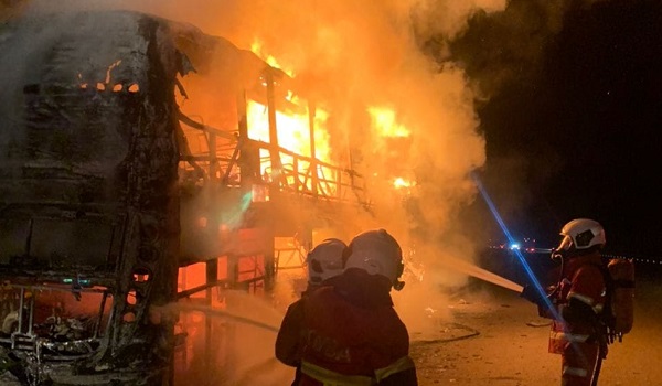 17 penumpang dan dua pemandu bagaimanapun dilaporkan selamat apabila berjaya keluar dari bas terbabit sebelum kebakaran merebak.