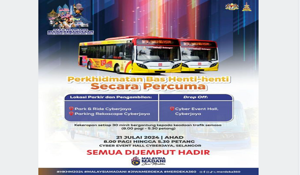 KUALA LUMPUR, 18 Julai – Perkhidmatan bas henti-henti secara percuma disediakan kepada pengunjung sepanjang Majlis Pelancaran Bulan Kebangsaan dan Kibar Jalur Gemilang 2024 di Cyberjaya, Selangor pada Ahad ini.