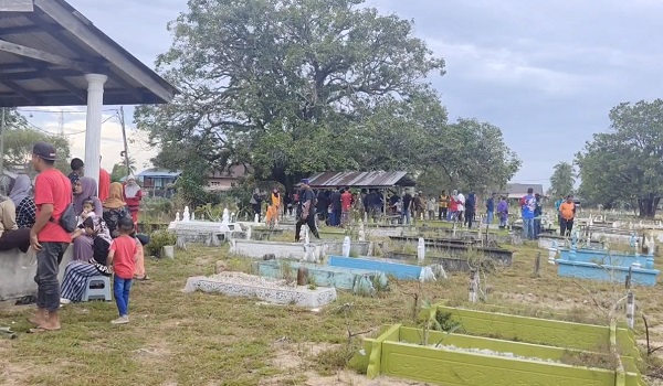 Suasana hiba menyelubungi tanah perkuburan apabila ahli keluarga dan sanak saudara tidak dapat menahan kesedihan apabila proses pengebumian berlangsung.