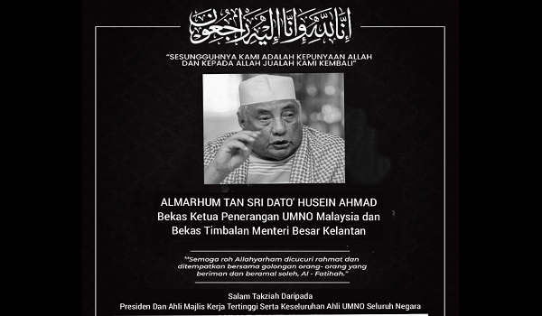 PASIR MAS, 13 September-Bekas Ketua Penerangan UMNO, Tan Sri Hussein Ahmad, 90, meninggal dunia akibat sakit tua di rumahnya dekat Kampung Lemal di sini pagi tadi.