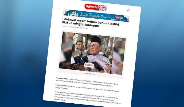 Terdahulu, Perdana Menteri mengumumkan BKK Aidilfitri RM500 kepada penjawat awam Gred 15 ke bawah yang akan dibayar mulai minggu depan.