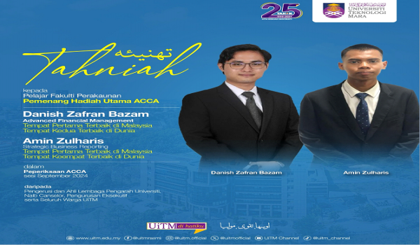 SHAH ALAM, 25 Oktober- Dua pelajar Fakulti Perakaunan Universiti Teknologi MARA (UiTM) berjaya mengharumkan nama negara apabila meraih kedudukan lima terbaik dunia dalam peperiksaan The Association of Chartered Certified Accountants (ACCA).