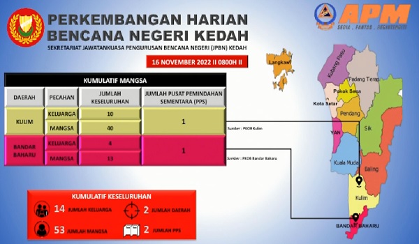 Ketua Bahagian Sekretariat Jawatankuasa Pengurusan Bencana Angkatan Pertahanan Awam Malaysia (APM) Kedah Mejar (PA) Muhammad Suhaimi Mohd Zain berkata sejumlah 53 penduduk terjejas daripada 14 keluarga ditempatkan di kedua-dua PPS berkenaan.