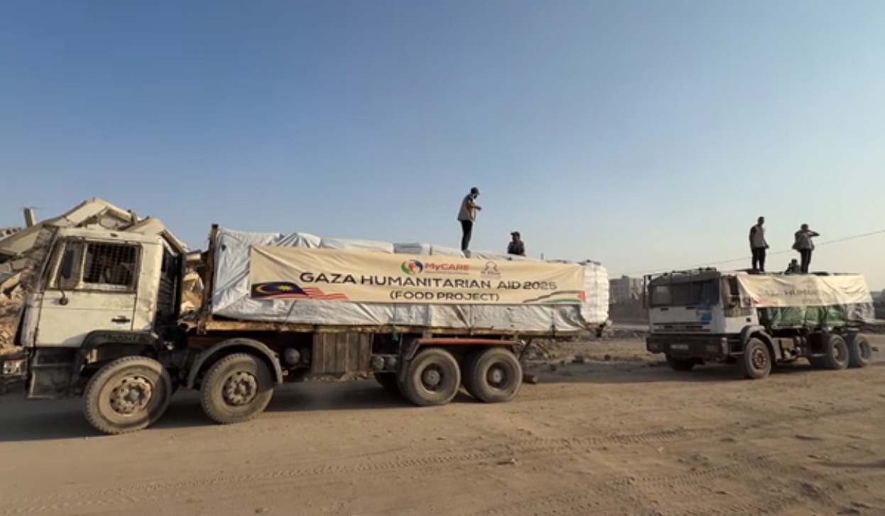 KUALA LUMPUR, 13 November -Dua buah trak bantuan kemanusiaan dari Malaysia berjaya memasuki Gaza melalui pintu sempadan Rafah minggu lalu, membawa 1,600 guni tepung.