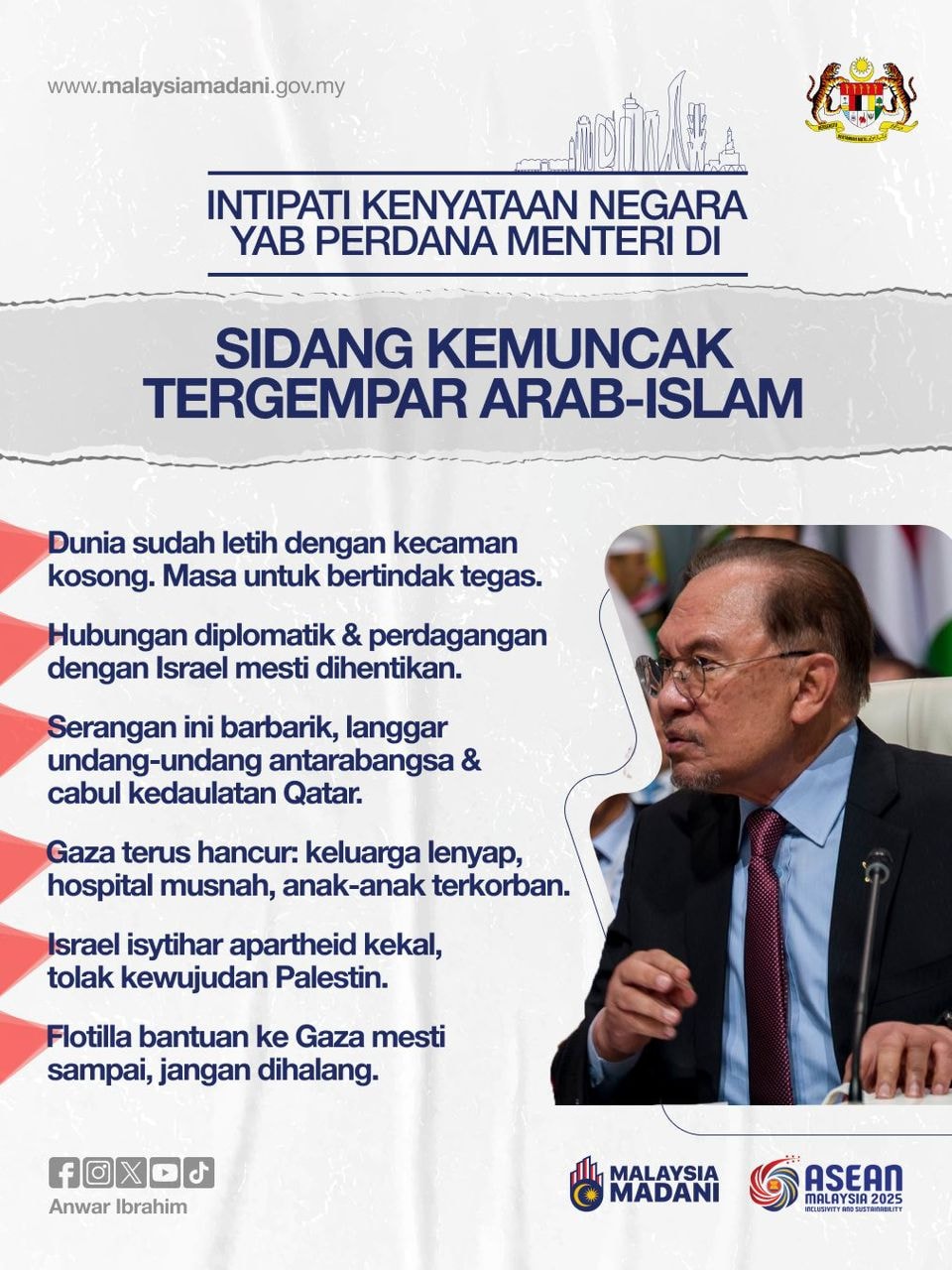 KUALA LUMPUR, 16 September - Perdana Menteri Datuk Seri Anwar Ibrahim hari ini menekankan enam intipati utama dalam kenyataannya di Sidang Kemuncak Tergempar Arab-Islam yang berlangsung di Doha, Qatar semalam.