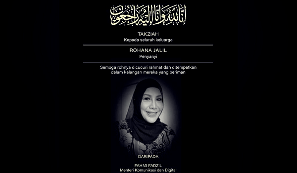 KUALA LUMPUR, 21 Jun- Menteri Komunikasi dan Digital, Fahmi Fadzil merakamkan ucapan takziah kepada keluarga penyanyi popular era 80an, Rohana Jalil yang meninggal dunia semalam.