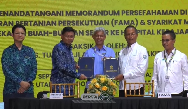 SERDANG, 19 September- Lembaga Pemasaran Pertanian Persekutuan (FAMA) menandatangani memorandum persefahaman (MOU) dengan Syarikat Medivest bagi pelaksanaan pembekalan buah-buahan segar tempatan ke 22 hospital kerajaan di Negeri Sembilan, Melaka dan Johor.