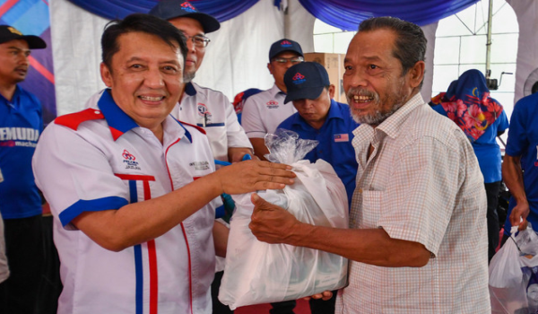 (Datuk Ahmad Jazlan Yaakub menyampaikan sumbangan bakul makanan kepada sebahagian