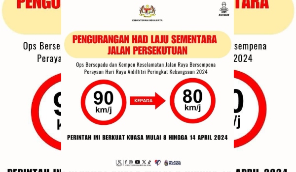 KUALA LUMPUR, 2 April- Sempena perayaan Aidilfitri had laju di jalan persekutuan di seluruh negara dikurangkan 10 kilometer sejam (km/j) bermula 8 hingga 14 April.