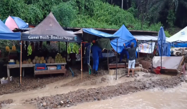 “Keadaan hujan lebat menyebabkan gerai menjual buah-buahan itu terjejas akibat limpahan air dan berlaku runtuhan kecil yang membawa timbunan batu-batu kecil sehingga ke kawasan gerai.