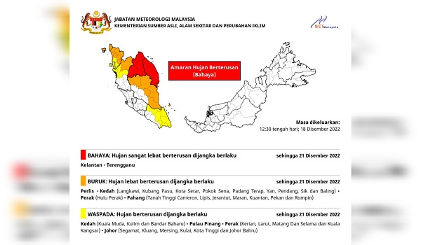 KUALA LUMPUR, 18 Disember- Jabatan Meteorologi Malaysia (MetMalaysia) mengeluarkan amaran hujan sangat lebat berterusan kategori bahaya di Kelantan dan Terengganu sehingga Rabu depan.