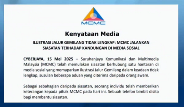 CYBERJAYA, 15 Mei – Susulan beberapa aduan yang diterima daripada orang awam, Suruhanjaya Komunikasi dan Multimedia Malaysia (MCMC) memulakan siasatan berhubung satu hantaran di media sosial yang memaparkan ilustrasi Jalur Gemilang dalam keadaan tidak lengkap.