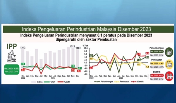 KUALA LUMPUR, 7 Februari- Indeks Pengeluaran Perindustrian, IPP menyusut 0.1 peratus tahun ke tahun pada Disember 2023 dipengaruhi oleh sektor pembuatan.