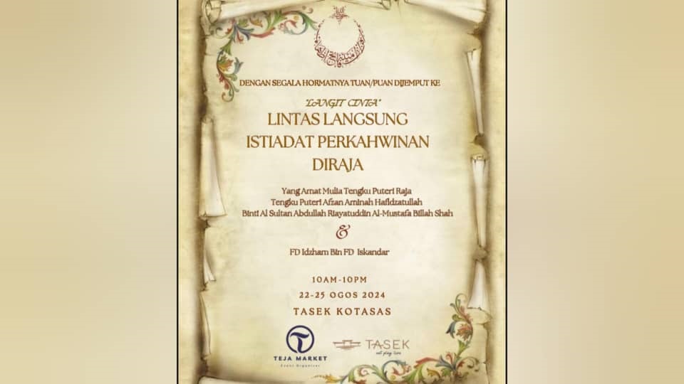 KUANTAN, 21 Ogos- Istiadat Perkahwinan Diraja Tengku Puteri Raja Tengku Puteri Afzan Aminah Hafidzatullah Al-Sultan Abdullah Ri’ayatuddin Al-Mustafa Billah Shah dan pasangan, FD Idzham FD Iskandar dijadual berlangsung selama tiga hari.