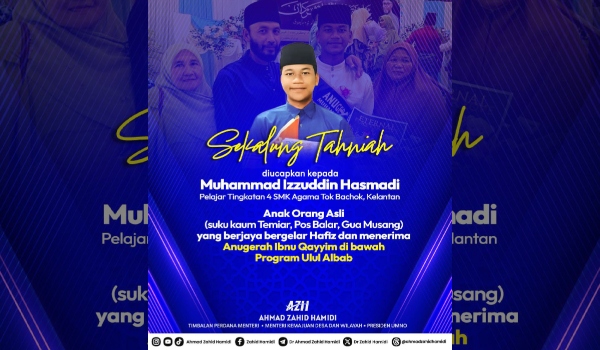 Beliau menerusi hantaran Facebook menyatakan perkara itu susulan kejayaan Muhammad Izzudin Hasmadi, anak muda berusia 16 tahun dari suku Temiar, Pos Balar, Gua Musang telah berjaya menjadi anak orang asli pertama yang menamatkan hafazan 30 juzuk al-Quran bawah program Ulul Albab, sekali gus menerima Anugerah Ibnu Qayyim.