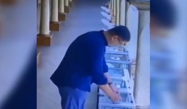 lelaki melekatkan kod QR pada kotak sumbangan derma di sebuh masjid)