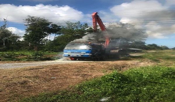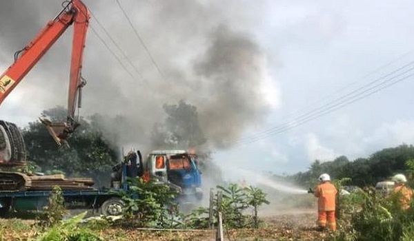 “Pasukan bomba dari Balai Bomba dan Penyelamat Tanjung Manis terus bergerak ke lokasi kejadian dan setibanya di tempat kejadian didapati kebakaran melibatkan sebuah lori yang membawa jengkaut yang tersangkut pada kabel elektrik.