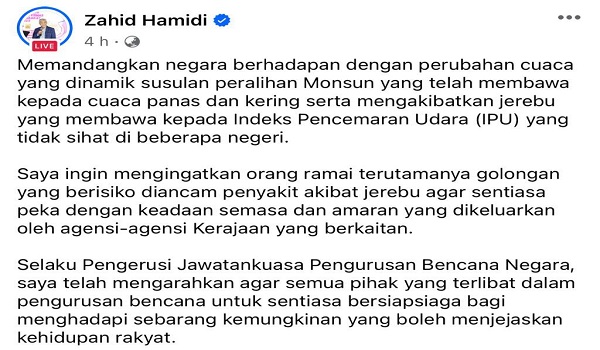 Ahmad Zahid yang juga Pengerusi Jawatankuasa Pengurusan Bencana Negara berkata, “negara kini berdepan dengan perubahan cuaca yang dinamik susulan peralihan monsun yang mengakibatkan cuaca panas dan kering serta jerebu.”
