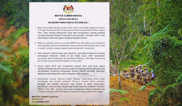 PUTRAJAYA, 16 Disember- Pasukan pegawai penyiasat daripada Jabatan Keselamatan dan Kesihatan Pekerjaan (JKKP) telah diarah untuk mendapatkan maklumat segera mengenai kejadian tanah runtuh di Batang Kali, Selangor.