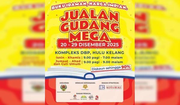 KUALA LUMPUR, 18 Disember - Dewan Bahasa dan Pustaka (DBP) dengan kerjasama Pertubuhan Penulis Sekolah Rumput menganjurkan Jualan Gudang Mega DBP bermula 20 hingga 29 Disember ini di Kompleks Dewan Bahasa dan Pustaka Hulu Kelang, Selangor.