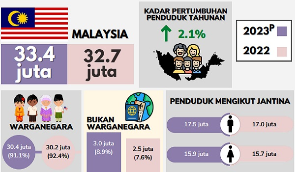 “Penduduk Warganegara meningkat daripada 30.2 juta pada 2022 kepada 30.4 juta pada 2023 dengan pertumbuhan yang kecil iaitu 0.7% (2022: 0.6%)”,” menurut kenyataan yang dikeluarkan Jabatan Perangkaan Malaysia (DOSM), hari ini.