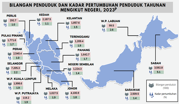 “Tiga negeri yang mencatatkan komposisi penduduk tertinggi pada 2023 ialah Selangor (21.6%) diikuti Johor (12.3%) dan Sabah (10.8%). Sebaliknya, W.P. Labuan dan W.P. Putrajaya mencatatkan komposisi penduduk terendah iaitu masing-masing 0.3% dan 0.4%”, kata Mohd Uzir.