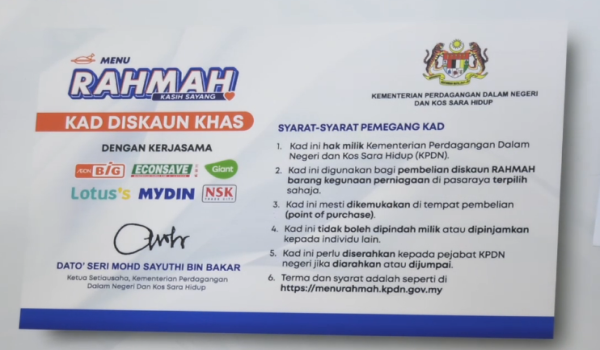 “Dalam melaksanakan program kad diskaun Menu Rahmah ini kita juga sekali lagi mendapat kerjasama rapat daripada industri dan setakat ini kita berterima kasih kerana telah ada enam pasaraya yang telah bersetuju bekerjasama atas nilai kasih sayang itu,” katanya.