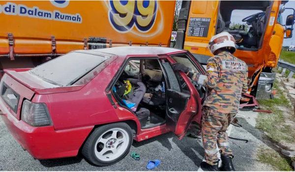 Insiden itu menyebabkan kereta dinaiki mangsa yang berada di lorong kanan laluan, merempuh sisi depan treler tersebut.