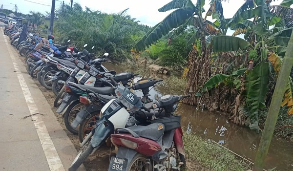 (Motosikal-motosikal yang rosak ditenggelami air, disusun ditepi jalan oleh penduduk)