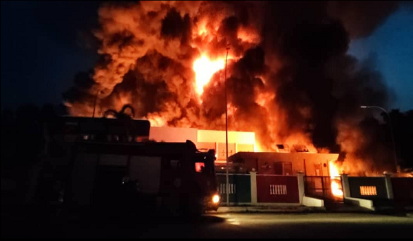 Semalam, dua bangunan sebuah premis pembuatan cat di Taman Perindustrian Meru terbakar kira-kira 6.20 pagi dan berdasarkan siasatan awal, kebakaran itu melibatkan kawasan penstoran bahan mentah mudah terbakar berunsurkan pelarut organik. -BERNAMA