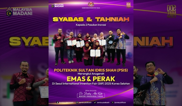 "Tahniah dan syabas diucapkan kepada Pasukan Politeknik Sultan Idris Shah (PSIS) atas kejayaan mengharumkan nama Malaysia di Seoul International Invention Fair (SIIF) 2025, Korea Selatan," menurut hantaran itu.