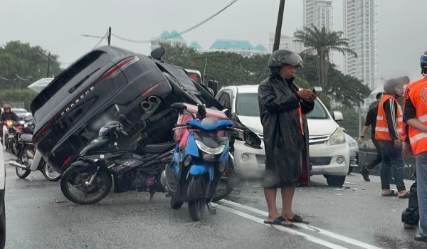 Terdahulu, tular rakaman kamera papan pemuka di media sosial yang memaparkan insiden membabitkan sebuah SUV dan sebuah kenderaan pelbagai guna (MPV) serta dua motosikal.
