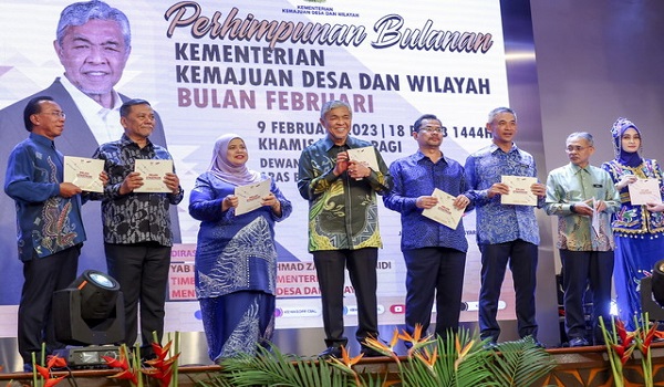 (Datuk Seri Dr Ahmad Zahid Hamidi (empati, kiri) dan timbalannya Datuk Rubiah Wang (tiga, kiri) menunjukkan Pelan Strategik 2022-2026 KEMAS pada majlis Perhimpunan Bulanan Kementerian Kemajuan Desa dan Wilayah (KKDW) Bulan Februari/BERNAMA)