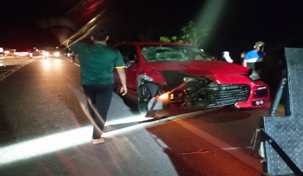 SETIU, 16 Mac– Sebuah kenderaan mewah rosak teruk di bahagian hadapan selepas melanggar seekor gajah dalam kejadian di Kilometer 45 Kampung Kolam Jalan Kuala Terengganu Kampung Raja di Merang Setiu malam tadi.