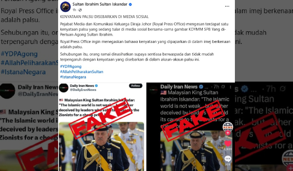 Hantaran itu turut menyertakan tangkap layar menunjukkan akaun media sosial menggunakan nama Daily Iran News yang memuat naik status kononnya kenyataan dikeluarkan Sultan Ibrahim berhubung dunia Islam. -BERNAMA
