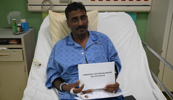 Semalam, Setiausaha Politik kepada Perdana Menteri Datuk Ahmad Farhan Fauzi menyampaikan bantuan kepada Saravanan, 54, yang kini sedang menjalani rawatan di Pusat Perubatan Universiti Malaya.