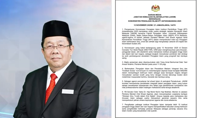 PUTRAJAYA, 12 November - Jabatan Kemajuan Islam Malaysia (JAKIM) dengan kerjasama Fakulti Pengajian Islam, Universiti Kebangsaan Malaysia (UKM) akan menganjurkan Konvensyen Pengajian Islam IPT Antarabangsa 2025 pada 13 November di Dewan Canselor Tun Abdul Razak (DECTAR) UKM, di Bangi, Selangor.