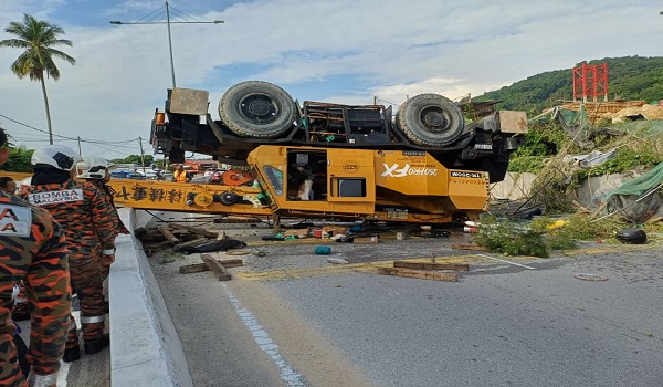 Penolong Pengarah Bahagian Operasi Kebombaan dan Penyelamat, Jabatan Bomba dan Penyelamat Malaysia (JBPM) Pulau Pinang, John Sagun Francis memaklumkan, kren terbabit telah terbalik dan menghalang lalulintas.