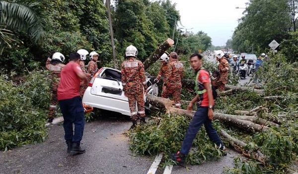 SEREMBAN, 4 April- Seorang lelaki maut selepas kereta dipandunya dihempap pokok tumbang di Jalan Senawang Paroi, Taman Rashidah Utama di sini, semalam.