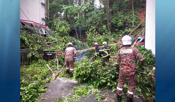 Setibanya di lokasi, bomba mendapati lima kenderaan yang diparkir di belakang hotel itu dihempap pokok tumbang.