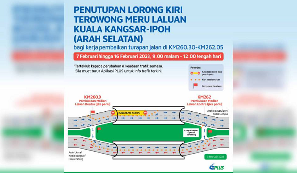 IPOH, 4 Februari- Lorong kiri di Terowong Meru bagi laluan Kuala Kangsar-Ipoh di Lebuhraya Utara-Selatan (PLUS) di Kilometer (KM) 260.30 hingga KM262.05 arah selatan ditutup bermula 7 Februari ini.