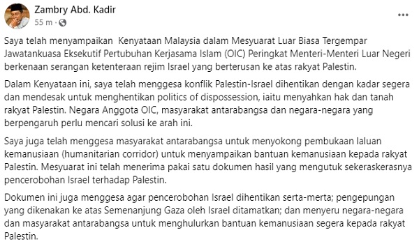 KUALA LUMPUR, 19 Oktober- Malaysia menggesa konflik Palestin-Israel di Gaza serta tindakan menyahkan hak dan tanah rakyat Palestin dihentikan pada kadar segera kata Menteri Luar Datuk Seri Dr Zambry Abd Kadir.