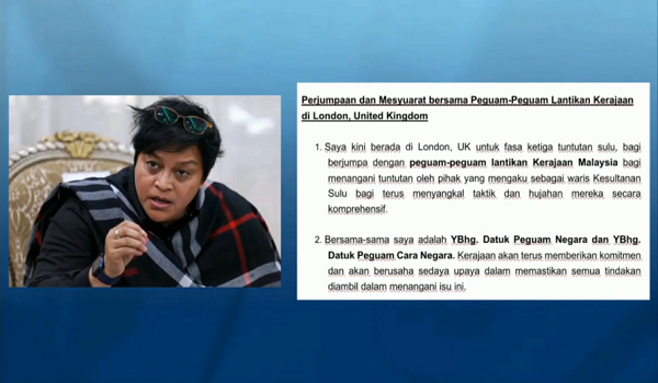 Azalina kini berada di London untuk berjumpa dengan peguam lantikan Malaysia, bagi tuntutan Sulu fasa ketiga oleh pihak yang mengaku sebagai waris Kesultanan Sulu.