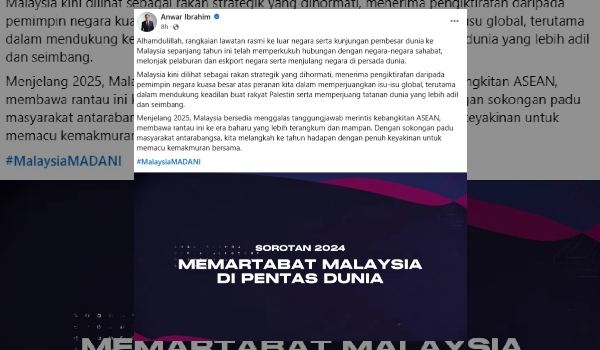 Perdana Menteri Datuk Seri Anwar Ibrahim menerusi satu hantaran di Facebook berkata, menerusi sokongan padu masyarakat antarabangsa Kuala Lumpur melangkah ke tahun 2025 penuh yakin untuk memacu kemakmuran bersama.