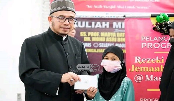 (Mufti Perlis, Profesor Madya Datuk Dr. Mohd Asri Zainal Abidin menyerahkan sumbangan kepada jemaah junior di sini)
