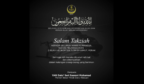 “Takziah kepada seluruh keluarga wira-wira TLDM yang terlibat dalam tragedi kemalangan helikopter di TLDM Lumut pagi tadi.
