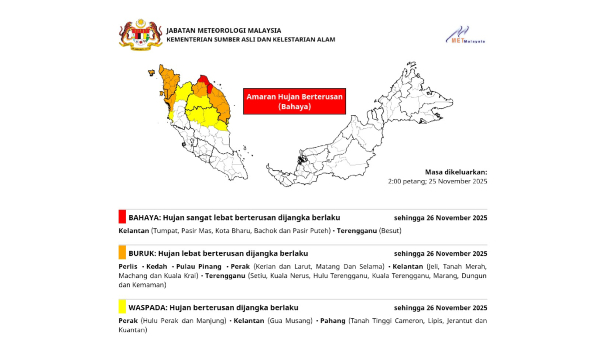KUALA LUMPUR, 25 November - Jabatan Meteorologi Malaysia (MET Malaysia) mengeluarkan amaran hujan berterusan membabitkan tiga tahap; bahaya, buruk dan waspada berkuat kuasa sehingga 26 November meliputi sebahagian besar negeri di Pantai Timur, Utara serta kawasan tertentu di Perak dan Pahang.